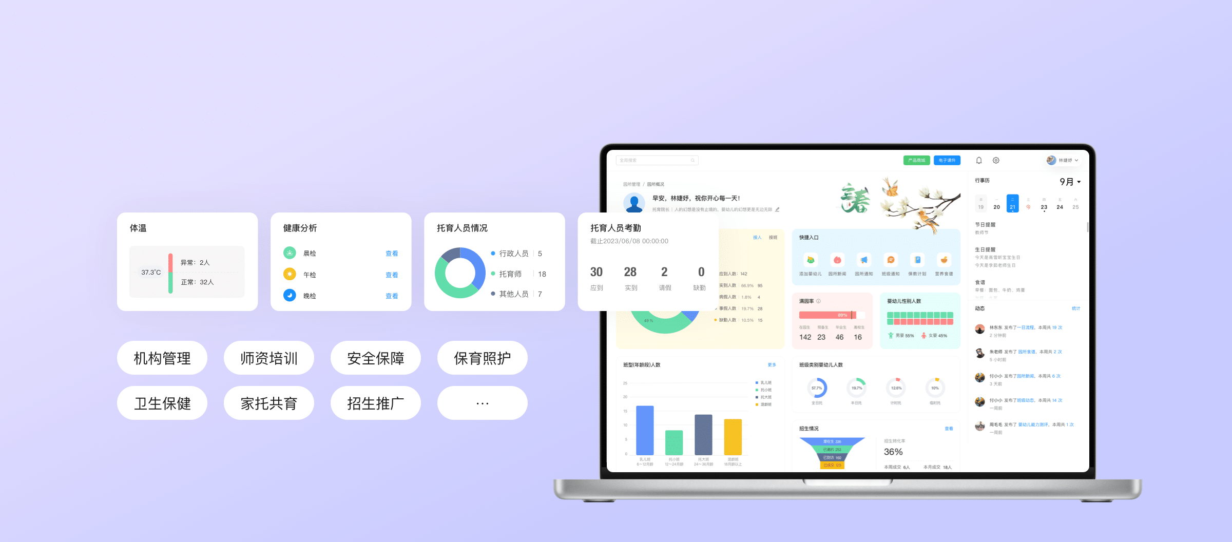 精准匹配管理刚需。深度适配托育专属场景,满足机构智能化管理核心需求。