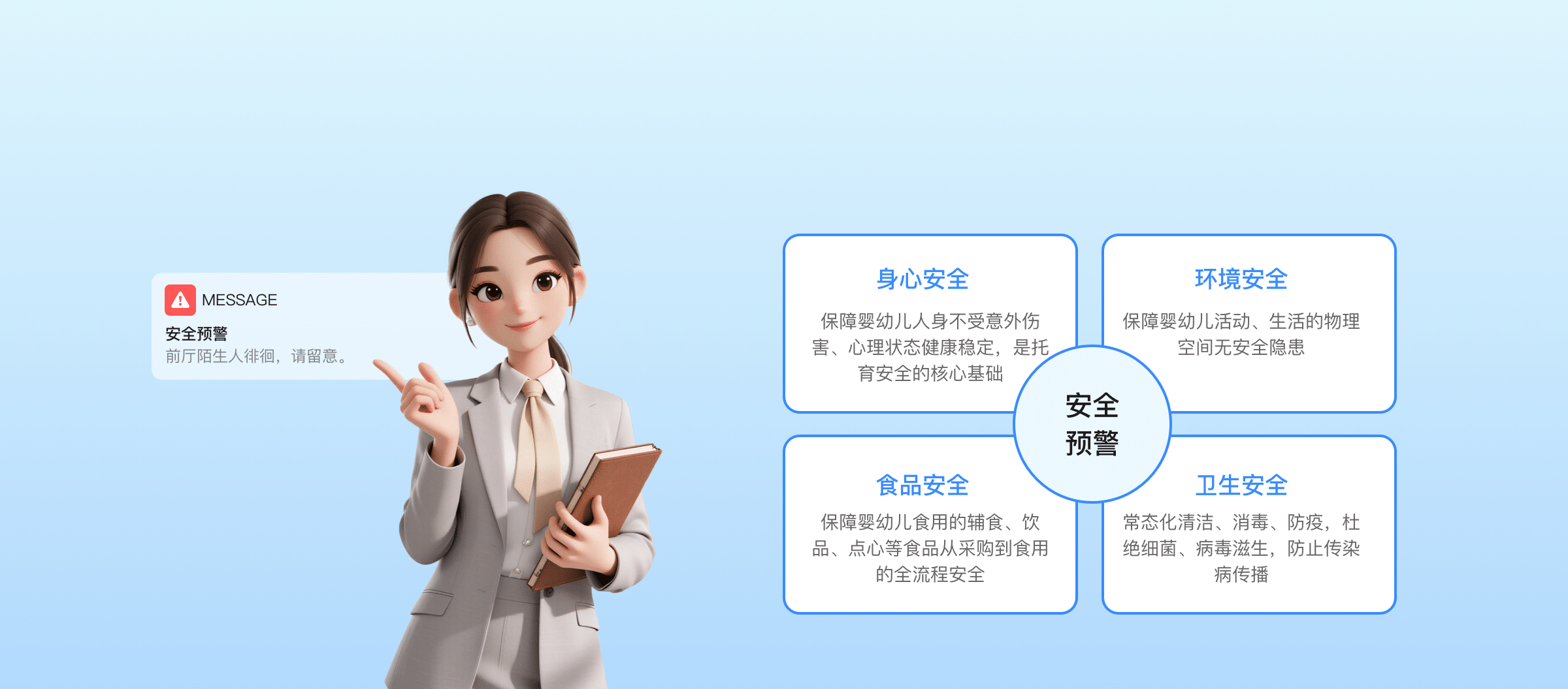 核心优势全流程风险闭环防控。覆盖托育各环节安全隐患,结合实时监测与智能预警,实现风险精准识别、管控。