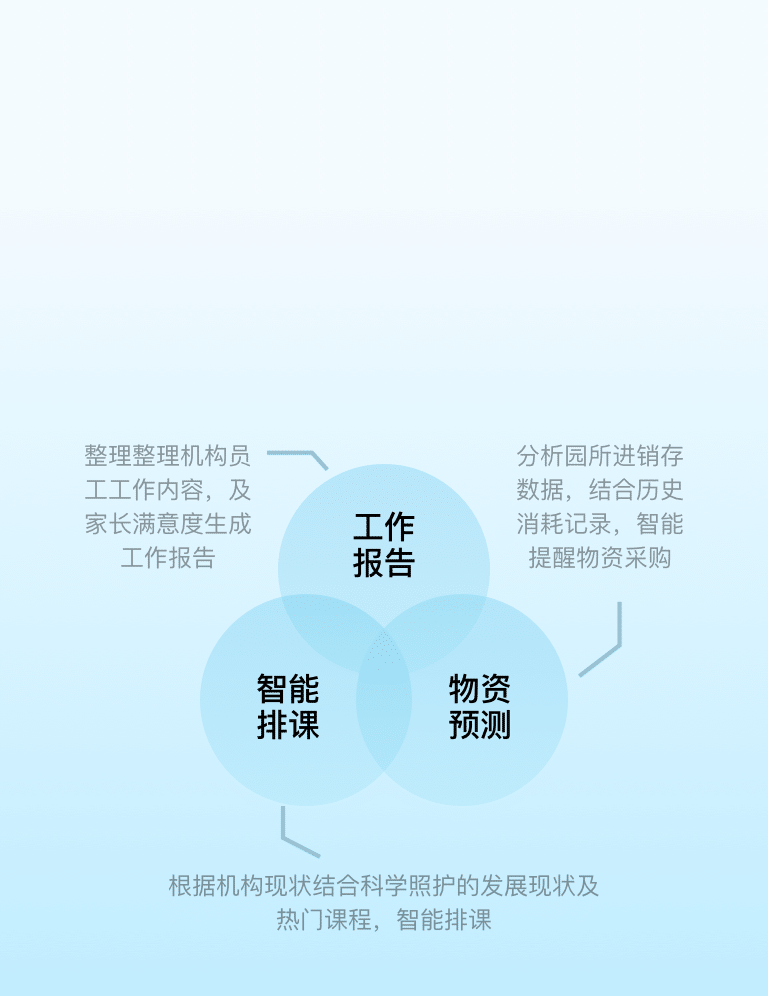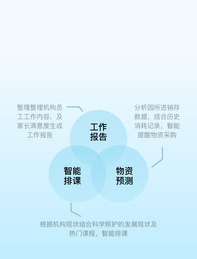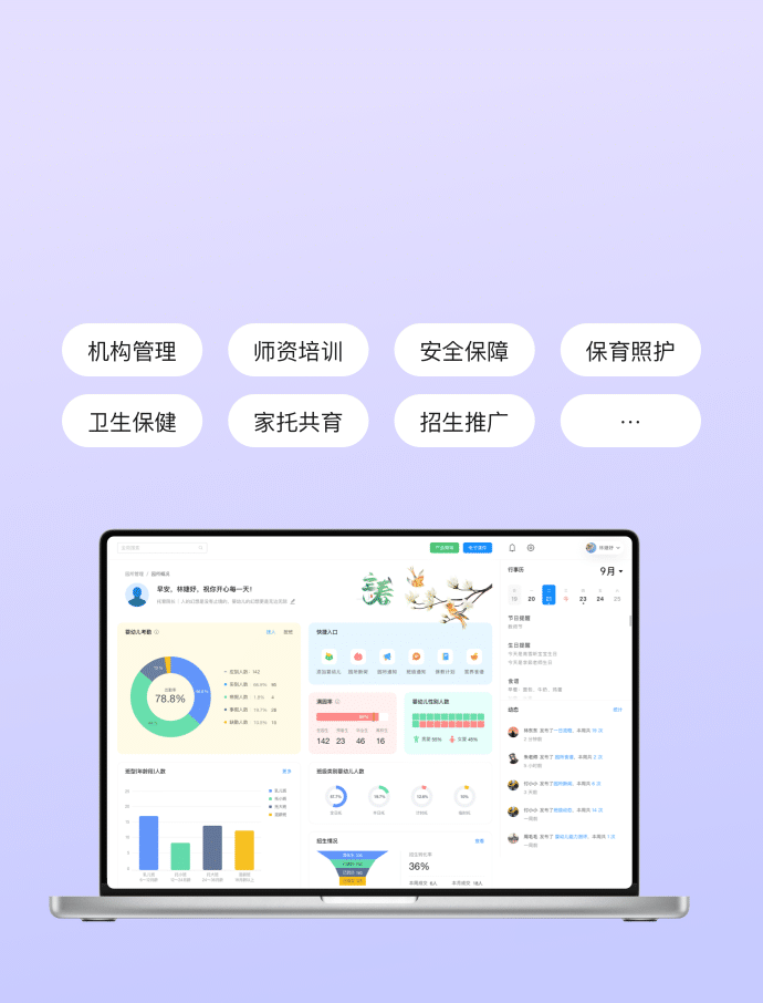 全场景、全方位解决托育机构人、财、物、事与家托共育,让托育机构的发展与新时代创新同频。全过程记录婴幼儿的成长轨迹,智能生成婴幼儿全周期成长报告,让家长安心送托。