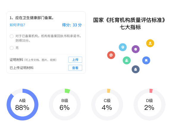 托育机构质量评估系统依托国家《托育机构质量评估标准》,通过大数据综合治理分析,全面检测托育机构质量水平,及时发现机构未达标情况,智能生成托育机构质量评估报告,提高托育服务质量,增强家长信任度。